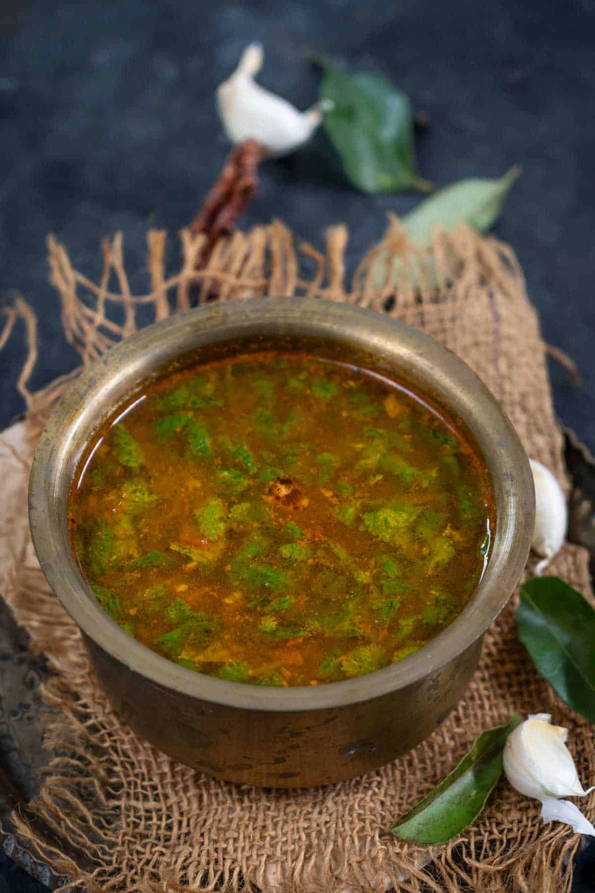 Pepper Rasam, also called Milagu Rasam, is a South Indian style soup made with lots of black pepper, cumin seeds, garlic, tomatoes, and a few other simple ingredients.